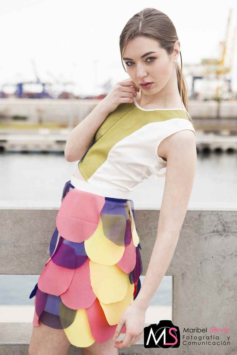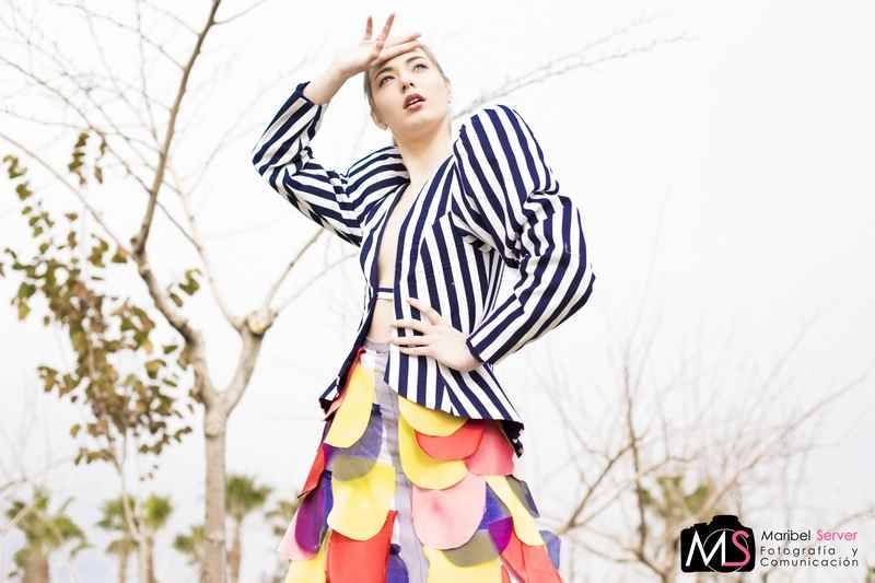 Por último, la americana de rayas con hombros marcados y la falta larga de pétalos de colores, es el estilismo más arriesgado y que impacta por mantenerse en el límite entre lo diferente, atrevido y lo elegante. Aprendí muchísimo realizando estas prendas, tanto en patrones como en técnicas de costura a medida. Cuando algo te gusta, no dejas de aprender, lo disfrutas.
